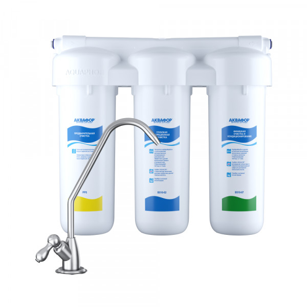 Не забывайте учитывать и срок службы фильтра: он указан в паспорте и определяет, когда модуль нужно заменить, даже если ресурс активной фильтрации в литрах еще есть.6000Высота, смОбратите внимание на габариты фильтра и измерьте, сколько свободного пространства в предполагаемом месте установки.29,6МинерализацияПроисходит после финишной очистки воды. Необходима прежде всего в фильтре обратного осмоса, поскольку такой фильтр полностью устраняет из воды все примеси, в том числе минералы. Минералы добавляются в оптимальной концентрации - для пользы и привычного вкуса воды.нетПостфильтрацияФинальный этап очистки воды: картриджи постфильтрации удаляют самые мелкие механические частицы и кондиционируют воду, придавая ей более приятный вкус.нетНакопительная емкостьОбычно нужна в фильтрах обратного осмоса. Глубокая фильтрация требует времени. Чтобы Вам не приходилось ждать, пока вода наберется в чайник или кастрюлю, почти во всех моделях используется накопительный бак для чистой воды или другая емкость. В стандартном фильтре обратного осмоса под мойку воды в баке достаточно для семьи из 5-6 человек.нетФильтрующий модуль в комплектедаОтдельный крандаДавление в водопроводе не более, атмМаксимальное давление воды на входе в систему, при котором возможна стабильная работа фильтра.6,5Ширина, смОбратите внимание на габариты фильтра, и измерьте, сколько свободного пространства в предполагаемом месте установки.33,2Глубина, смОбратите внимание на габариты фильтра, и измерьте, сколько свободного пространства в предполагаемом месте установки.10,5Защита корпуса от гидроударовдаИсходная водаЖесткая вода – вода с избытком минеральных солей. От нее появляется накипь в чайнике, известковый налет на сантехнике и разводы на посуде. Мягкая вода – та, в которой мало минеральных солей. Нет накипи в чайнике и разводов на посуде. Фильтры для мутной воды и фильтры от ржавчины, как правило, имеют несколько стадий очистки и дополнительный полипропиленовый картридж. Он задерживает механические частицы ила, песка и ржавчины и защищает картриджи более глубокой очистки.мягкаяУстраняет мутностьМутность водопроводной воды может говорить о том, что в ней много мелких механических частиц. Важно, чтобы в фильтре был установлен дополнительные картридж механической предфильтрации (полипропиленовый) - он продлит жизнь остальным картриджам более тонкой очистки.даУстраняет ржавчину, бурый осадокЛюбой фильтр под мойку удалит из воды крупные и мелкие частицы ржавчины. Некоторые фильтры имеют повышенный ресурс по железу: они дольше служат в такой воде, поскольку лучше подходят для удаления из воды железа и механических частиц ржавчины.даЗащита от бактерийВсе проточные фильтры в той или иной степени защищают от бактерий. Например, добавление серебра препятствует их размножению. Это стандартная степень защиты. Если в семье есть дети, пожилые люди или аллергики, воду рекомендуется обеззараживать, то есть полностью удалять микроорганизмы. Повышенную защиту от бактерий дают фильтры с половолоконной мембраной. Это пучок трубок с порами размером 0,1 микрон (что в 1000 раз тоньше человеческого волоса) - бактерии и яйца паразитов “застревают”, как в “сите”. Полученную воду не придется кипятить и можно использовать для приготовления детского питания. Абсолютную з